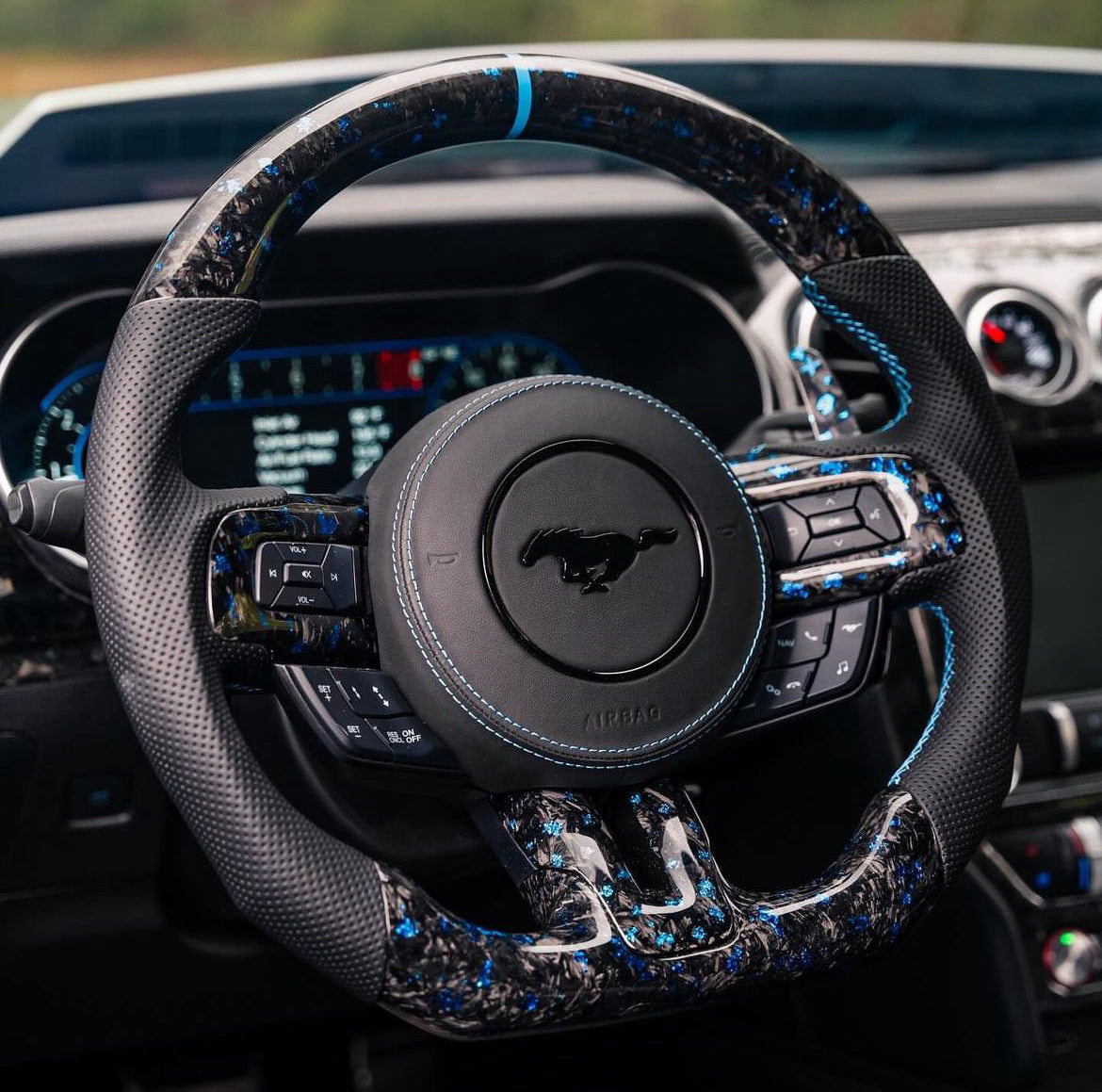 Feine blaue Farbsplitter im Forged Carbon schaffen eine edle, individuelle Optik und setzen starke Highlights im Innenraum.